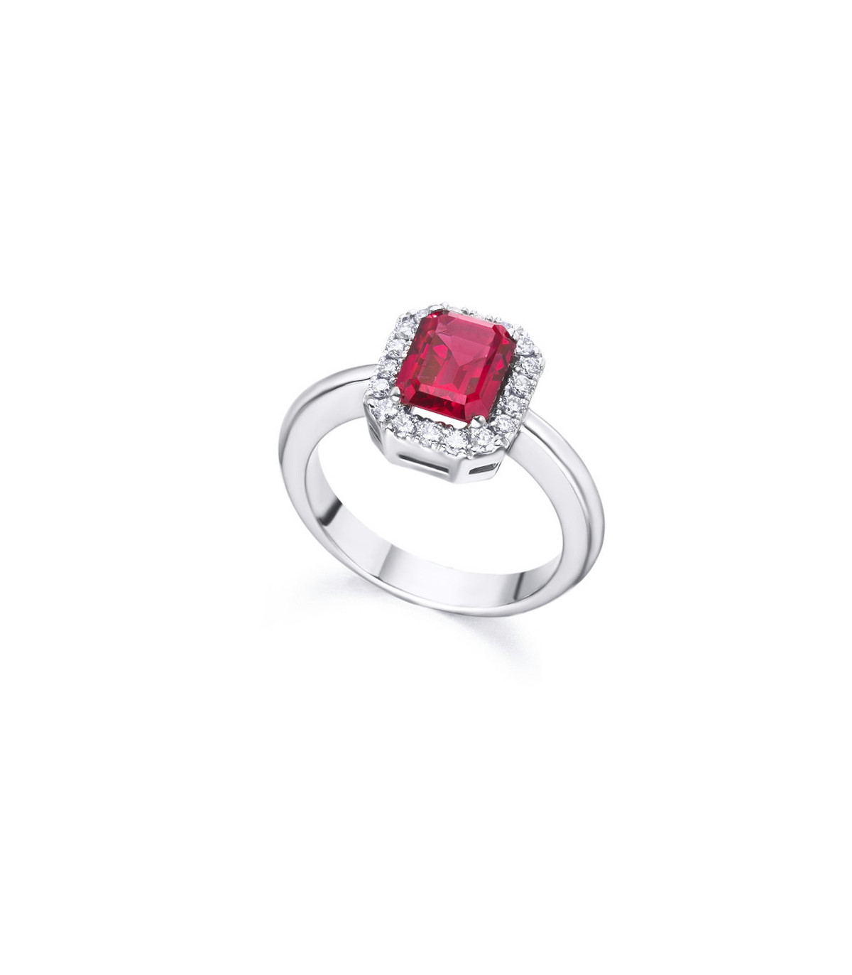 Anillo de oro blanco de 18 quilates con Rubí tratado talla octogonal de 8x6 mm. dediámetro y orla de Diamantes talla brillante calidad H/VS peso total 0,26 cts.
